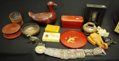 including: lacquer duck figure; Buddha head figure; Japanese bento box; various lacquer storage boxes; 3 Oriental deity figures; and a decorative metal belt. -