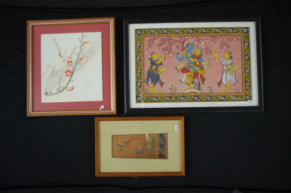 Watercolour on paper, signed lower left, 26cm x 23cm along with a silk embroidery artwork, 21cm x 9cm and an Indo Persian gouache on paper, 28cm x 45cm -