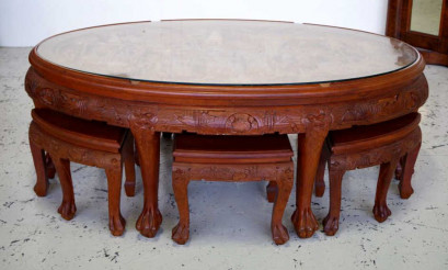 comprising of an oval table with highly carved glass carved top and 6 smaller tables / stools, . Approximate dimensions: 145cm x 93cm x 52cm -