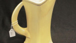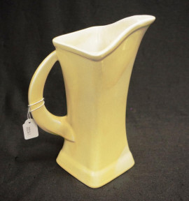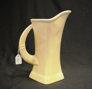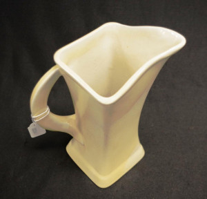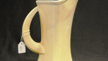 cream glaze jug, with formed decorative handle, marked to base, (height 24cm approx). -