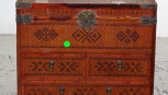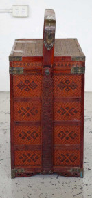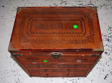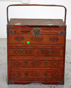 with hinged lid top, 4 drawers and woven cane outer, 58cm wide, 34.5cm deep, 74.5cm high approx (handle up) -