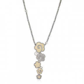 Set to the front with a graduated articulated line of five floral motifs, each embellished with a stylised design of pavé-set diamonds and cream enamel, completed by a fancy chain of annular beads accented at intervals with scroll motifs and completed by a parrot clasp, the diamonds together stated to weigh 2.13 carats, pendant length approximately 90mm, chain circumference approximately 499mm, adjustable, signed la Nouvelle Bague, Italian maker's marks. -