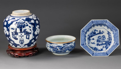 Lot Description:Three Chinese blue and white wares, Qing Dynasty, 18th century and later