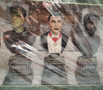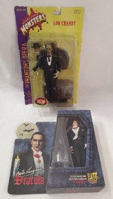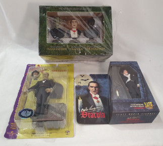 statuettes of Frankenstein, Dracula and Wolfman, from Sideshow Collectables, MIB, 2004; Universal Sideshow Toys “Phantom Of The Opera” Lon Chaney Figure - Series Two, MIB (some creasing to lower corner of box), 1999; Flatt World “Dracula” Bela Lugosi Figure - MIB (a few small dents to box plastic),1998. -