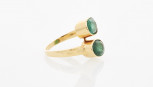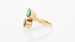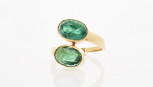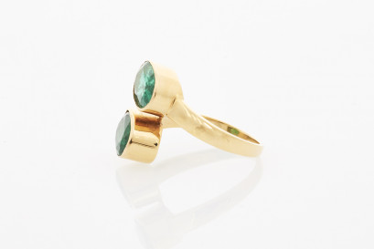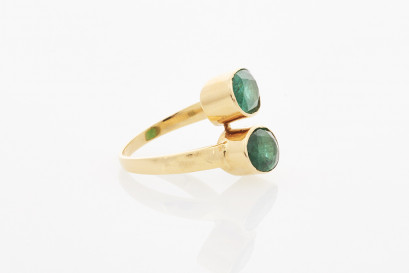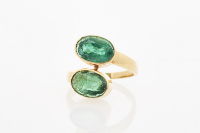 18ct yellow gold ring, bezel-set with two oval-cut Zambian emeralds. Half-round profile shank, stamped 18K