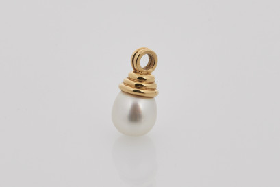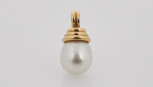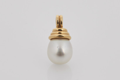 18ct yellow gold, set with 12mm oval Australian south sea pearl, to a triple layer gold cap and bail, unstamped