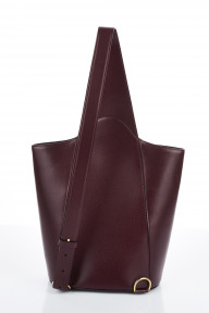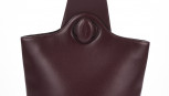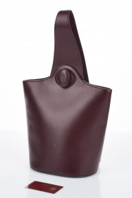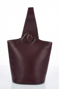burgundy leather one-shoulder backpack with gold metal hardware, double C logo on twist closure, labelled 'MUST de CARTIER' -