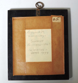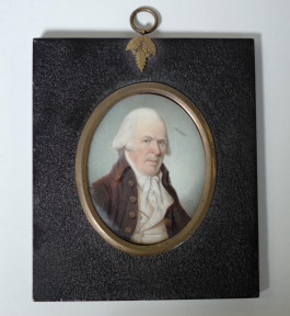 an oval miniature on ivory in black frame of a Gentleman, grey hair, dark brown coat, white shirt and stock and beige waistcoat, painted by Alexander Galloway (initialed) dated 1797.