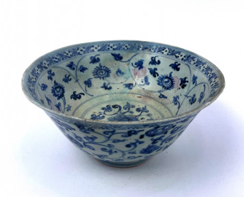 Lot Description:A Large Blue & White Footed Bowl Depicting Central Lotus Motifs, Crosshatched Detail to Rim & Expressive Floral Detail to Outer Cavetto, Ming Dynasty