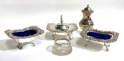 Lot Description:A Collection of Silver Plate Mustard Pots & Salts, Some with Blue Glass Liner