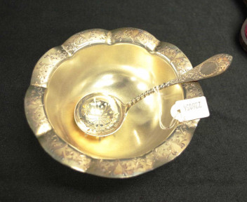 sugar bowl with English mark to base, together with a pierced sugar spoon, in original fitted case). -