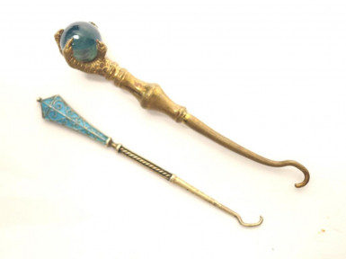 clutching glass marble, approx 8.5cm, together with a silver gilt and enamel button hook (unmarked but prob. Norwegian) -