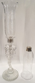 with frosted glass figural support, etched shade and prismatic drops, etched mark to base. Height: 61 cm. Together with A MATCHING SHADE. (2) -