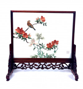 Lot Description:A Chinese Suzhou Embroidery Depicting Floral & Bird Motifs in Ornately Carved Timber Frame