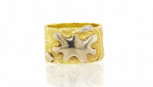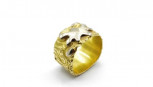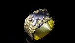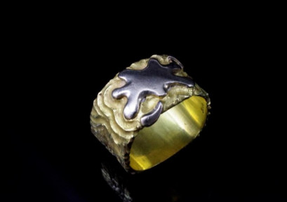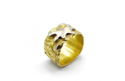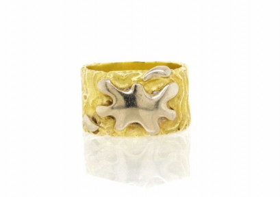 with a plane "splash" cartouche, marked 18ct RM. Approx width 13mm, weight 16 grams, ring size T -