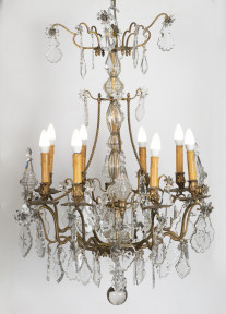 with shaped drops, rosettes, spears and pillar forms, cascading garlands of gilt beads and curvaceous arms supporting floriform sconces and electric candles