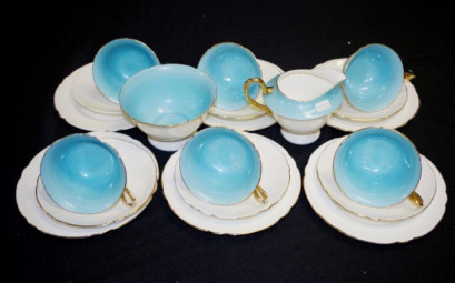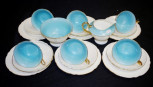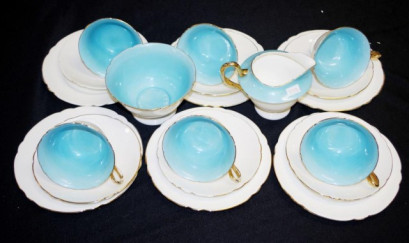 comprising: 6 trios, (each white ceramic cup with blue interior), together with a matching cream jug, and sugar bowl, marked to bases and # 2003/25. -