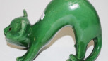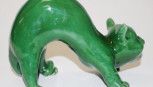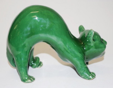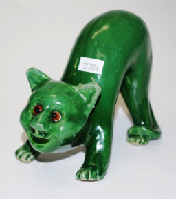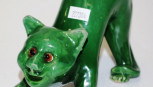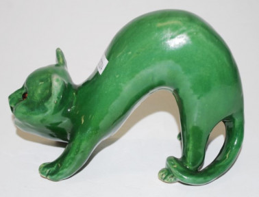 Lot Description:Green pottery cat with glass eyes