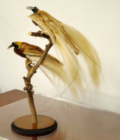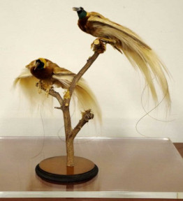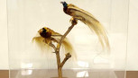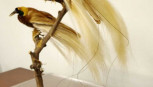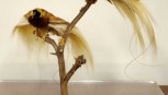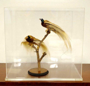 perched on a mounted branch, contained in a clear perspex showcase, 67cm x 52cm, 62cm high approx -