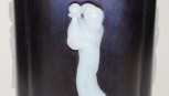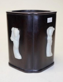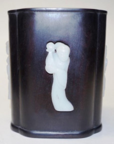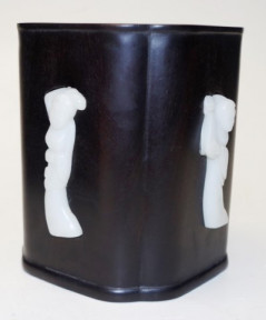 wooden brush pot, with carved jade figures applied decoration to each of 4 sides, (height 15cm; diameter 12.5cm approx). -