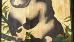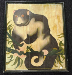 painted lemur type animal image on wood panel, (72cm X 60cm approx, total dimensions). -