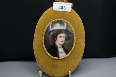 Lot Description:Antique European hand painted porcelain miniature of a lady with a hat