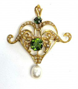 Lot Description:A Late Victorian 15ct Yellow Gold Green Tourmaline & Seed Pearl Pendant/Brooch