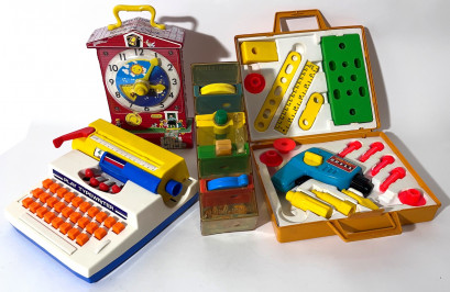 Lot Description:A Collection of Vintage Fisher Price Toys including a Tool Kit, Music Box Teaching Clock & Tumbling Tower c. 1970