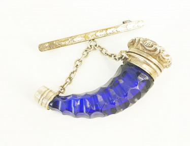 Lot Description:An Antique Miniature Sterling Silver Mounted Blue Glass Hunting Horn Flask