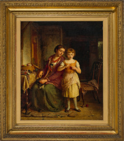 signed and dated lower right: George Smith 1884; inscribed verso: George Smith / The Knitting Lesson -