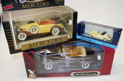 Scale 1:18 together with Mira Mercedes Ref 2011, Scale 1:24, die cast and in original boxes and a Vitesse Mercedes Benz 170 V, Scale 1:43, no packaging -