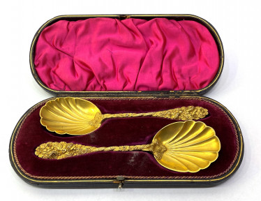Lot Description:A Cased Pair of Gilt Serving Spoons with Floral Handles