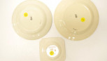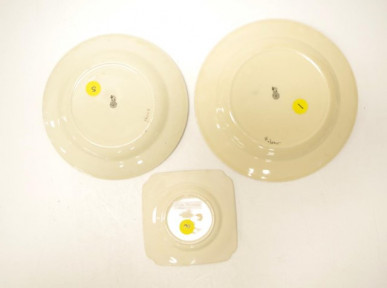 largest round plate diameter 27cm signed Noke, medium round plate diameter 24cm, and square side plate width 15cm signed Noke -