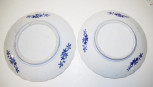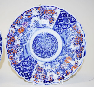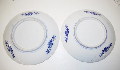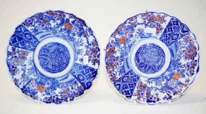 each with blue and white and iron red blossoms decoration, scalloped borders, impressed mark to bases, (diameter 22cm approx, each). -