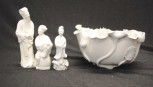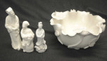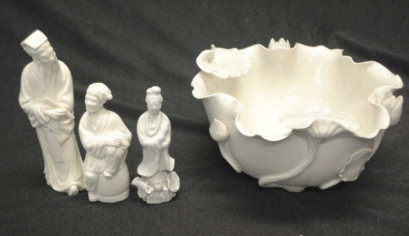 applied lotus flower and leaf decoration, (height 11cm; diameter 20cm approx); together with 3 various Chinese blanc de chine traditional figures, (height 16cm approx, tallest figure). -