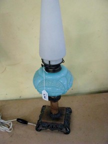 Lot Description:Electrified oil lamp, turquoise glass reservoir