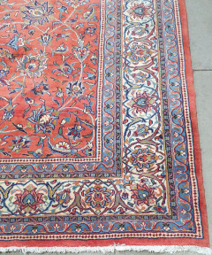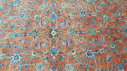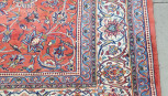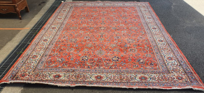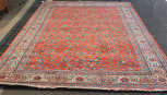 the allover scrolling foliate design on a terracotta red field, 100% wool pile on cotton foundation. Dim: 345 x 255 cm. -