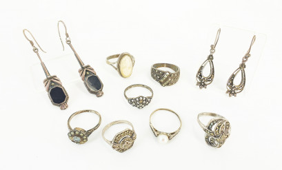 including marcasite set rings, shell cameo ring, a pair of drop earrings and cultured pearl ring. As found - some rings distressed, some pieces missing some stones. Weight (all in) 30.5g. -
