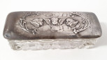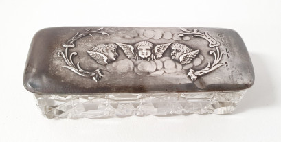 with repousse cherubs to lid. Hallmarked Henry Matthews, Birmingham, 1906. Dimensions 2.6 x 8.5 x 3cm. -