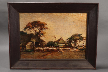 of rectangular form, decorated a scene of sheep entering a thatched barn with cottage, trees and farmer, framed, signed verso, a/f (hairline), 39cm x 48cm -