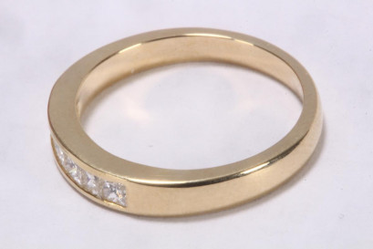 stamped 750, featuring six channel set princess cut diamonds on an 18ct yellow gold band, total weight 3.96gm, size M -