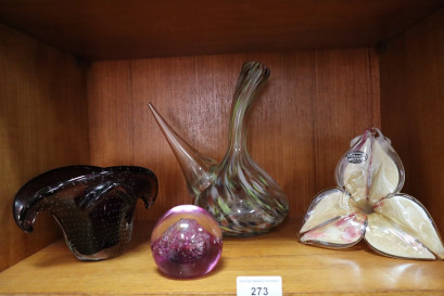 Fireball Scotland paperweight, purple art glass vase and multicoloured art glass vase, heights from 7 to 25 cm -