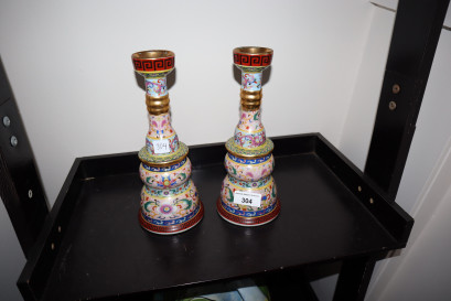 Lot #304 - Chinese signed gilt and floral pair of candle holders