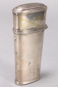 unmarked, of tapering form, decorated with three ridged borders, cover opening to reveal an inset multipurpose frame, total weight 47gm, height 9.5cm -