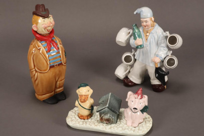 in the form of a man wearing a suit and hat, height 24cm, together with a German figural decanter with five cups, height 21cm and a novelty cruet set, height 11cm and length 19cm (3)