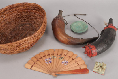 including a woven basket of oval form, two powder horns, a wooden fan, a/f, a small dish and a stone seal (qty) -