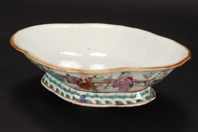 of quatrerfoil form, the exterior set with a frieze of court figures within a garden setting, raised on spreading base, length 23.5cm