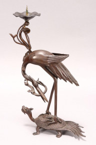 in the form of a stalk standing on the shell of a feng shui dragon, with neck stretched downwards, holding a stem in its beak, flowering stem twists upwards to open flower sconce (detachable), height 28cm