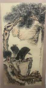 of rectangular form, depicting two vultures perched on a rock with a tree and foliage, in tones of brown, green, black and white,script and seal marks to middle right, 137cm x 68cm -