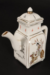 of facetted form, decorated with script and panels, panels depict scene of women in an outdoor settings, in tones of brown, green, orange and purple on a white ground accented with gilt, standing on four feet, with a seal mark to base, height 18.5cm -